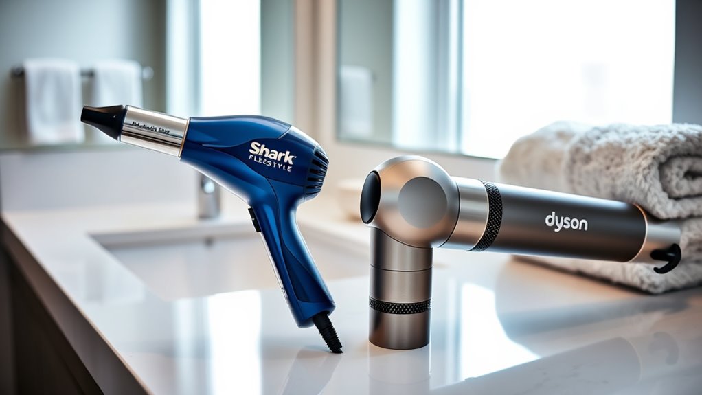 If you’re packing for a trip, considering the portability and travel features of the Shark FlexStyle and Dyson Airwrap can make a big difference. Both are lightweight and compact, making them easy to slip into your suitcase or carry-on. The Dyson Airwrap often needs a voltage converter for international use, while the Shark FlexStyle usually has dual voltage, so it works worldwide without extra adapters. Some models even feature foldable parts, enhancing portability during travel. Many come with travel bags or cases, protecting the device and accessories on the go. If you’re a frequent traveler, dual voltage capability and foldable designs make the Shark FlexStyle a convenient choice. Meanwhile, the Dyson Airwrap’s compact design still offers travel-friendly features, especially with the right adapters.
