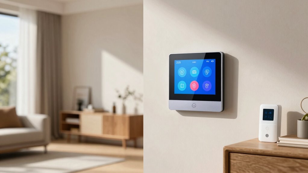 Integrating security features into smart thermostats with room sensors can substantially boost your home’s safety. Many models include occupancy detection and real-time motion alerts, helping you monitor activity and identify unusual movements. Some thermostats connect seamlessly with security systems or doorbell cameras, allowing visual verification and communication without leaving the app. Infrared-equipped sensors can detect presence and monitor activity patterns, alerting you to potential security breaches. Advanced sensors can trigger notifications or activate security devices like alarms or cameras if unexpected motion occurs. Additionally, integration with smart home ecosystems creates a unified system that manages both climate and security effortlessly. These features not only enhance convenience but also provide peace of mind, ensuring your home is safer and more responsive to any threats.