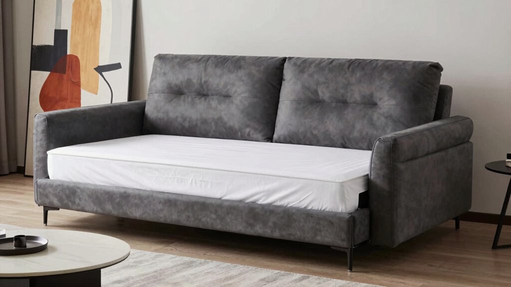 I recommend looking for queen sofa beds with frames made of hardwood like oak or maple, as they’re incredibly sturdy and long-lasting. For the upholstery, tight-weave fabrics such as polyester or microfiber resist wear and stains better than delicate materials. The mattress should have high-density foam or innerspring coils for durability and comfort. Choosing quality materials guarantees your sofa bed remains functional and attractive for years to come.