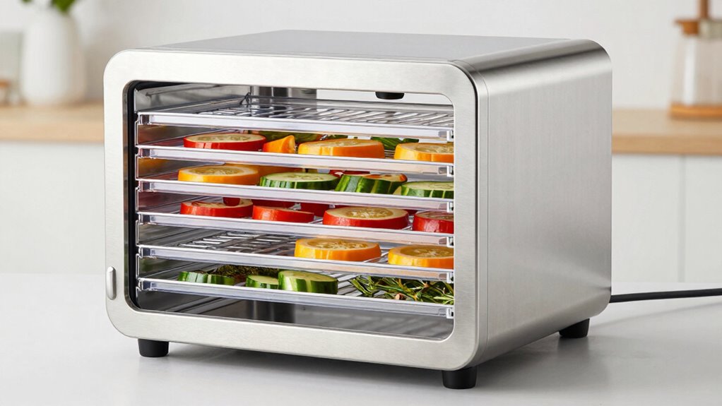 Choosing the right stainless steel dehydrator isn’t just about features—it’s about revealing your culinary potential and savoring the joy of homemade snacks. Imagine the satisfaction of perfectly dried fruits and herbs, delivered effortlessly through durable, precise equipment. As you consider these top models, remember: investing in quality isn’t just a choice, it’s a step toward healthier, tastier living. Don’t wait—your flavorful, preservative-free creations await, ready to transform your kitchen into a haven of delicious possibilities.