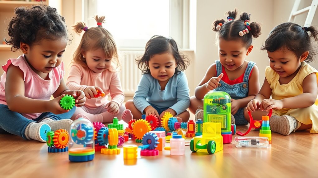 Safety features are vital considerations when selecting STEM toys for toddlers, as their curiosity often leads them to explore every aspect of their toys. I always check that the toys are made from non-toxic, BPA-free, and food-grade materials to protect their health. Rounded edges and smooth surfaces are imperative to prevent cuts and scrapes during play. For magnetic toys, I ensure the magnets are securely sealed and meet safety standards, reducing choking hazards. Small parts should be appropriately sized for the child’s age to avoid accidental swallowing. I also look for toys with recognized safety certifications like ASTM, CPC, or CE, confirming they meet international safety standards. Prioritizing these features helps keep playtime safe and enjoyable.
