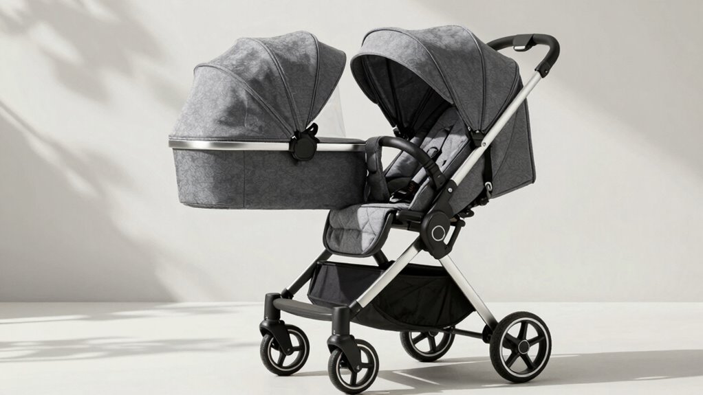 Ever wonder how much easier your day could be with a stroller that folds in seconds? A stroller with an easy one-hand folding mechanism makes collapsing and storing a breeze, saving you time and effort. Compact fold designs are especially helpful for fitting the stroller into car trunks or small storage spaces, perfect for travel or apartment living. Quick-release wheels further speed up the process, allowing for faster folding and unfolding during outings. Locking fold locks provide peace of mind, ensuring the stroller stays securely folded when not in use. Additionally, lightweight frames combined with foldable features make handling and transporting the stroller less tiring, even when you’re managing multiple tasks. All these factors contribute to a more convenient, stress-free experience with your reversible seat and bassinet stroller.