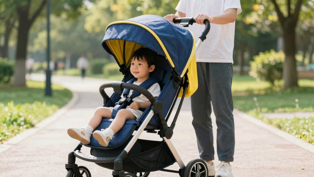 Since durability is essential for a stroller with a standing platform, I focus on models built from sturdy materials like aluminum frames, heavy-duty plastics, and reinforced fabrics. These materials can withstand daily wear and tear, ensuring the stroller lasts over time. High-quality, wear-resistant wheels, such as shock-absorbing EVA or rubber tires, improve longevity and provide smooth rides across different terrains. Reinforced joints and secure fastening mechanisms in the frame prevent wobbling or breakage, enhancing safety and resilience during extended use. I also look for materials that are odor-free, non-toxic, and free from harmful chemicals, which adds to the stroller’s safety and lifespan. Regular maintenance and cleaning of fabrics and moving parts are essential to preserve the stroller’s integrity and extend its lifespan.