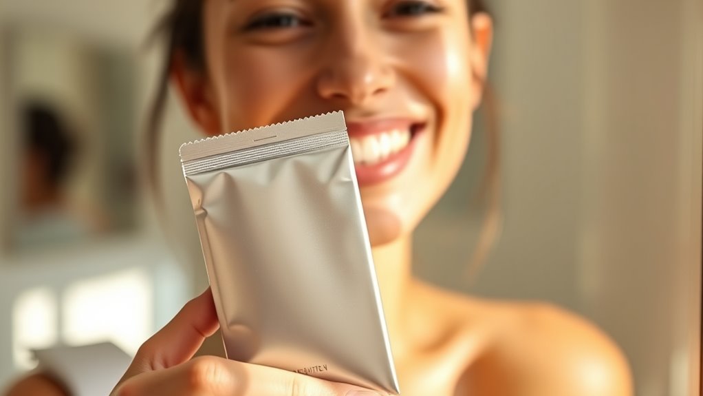When choosing teeth whitening strips for sensitive teeth, paying attention to treatment duration and frequency is crucial to avoid irritation. Most strips recommend wearing them for at least 30 minutes per session for the best results. Consistent use, usually daily or every other day, over 1 to 3 weeks is necessary to see significant whitening. Some express options can deliver visible results in just 7 days with shorter wear times. However, increasing treatment duration or frequency may heighten sensitivity risks, so it’s essential to follow the product’s guidelines carefully. Limiting the treatment course to the recommended number of days helps prevent discomfort and irritation. Staying within these parameters ensures effective whitening while protecting your sensitive teeth.