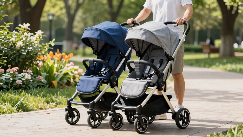 When choosing a twin stroller side by side, maneuverability and wheel design are essential for steering through different terrains with ease. The size and type of wheels greatly influence how smoothly the stroller handles bumps and obstacles. Rubberized, shock-absorbing wheels improve ride comfort and stability. Swivel front wheels that can lock give you better steering in tight spaces and extra stability on uneven surfaces. Larger rear wheels make it easier to roll over rough terrain and obstacles, enhancing overall control. The wheel diameter, typically between 4.9 and 7 inches, affects turning radius and ease of steering, especially in narrow areas. Additionally, all-wheel suspension systems absorb shocks and vibrations, making rides smoother for your children across various terrains.