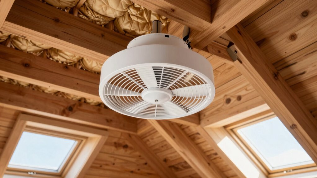 Choosing the right size for your whole house attic fan is essential to guarantee effective ventilation without wasting energy. The fan’s size should match your home’s square footage to ensure proper airflow. Experts recommend providing at least 1 square foot of attic venting per 750 square feet of living space for ideal performance. Larger areas need fans with higher CFM ratings to cool and ventilate effectively. It’s also important to take into account your attic’s shape and dimensions, as irregular spaces might require multiple fans or custom solutions. Proper sizing prevents over-ventilation, which wastes energy, or under-ventilation, which leaves your home inadequately cooled. Taking these factors into consideration helps you select a fan that balances efficiency with effective airflow.